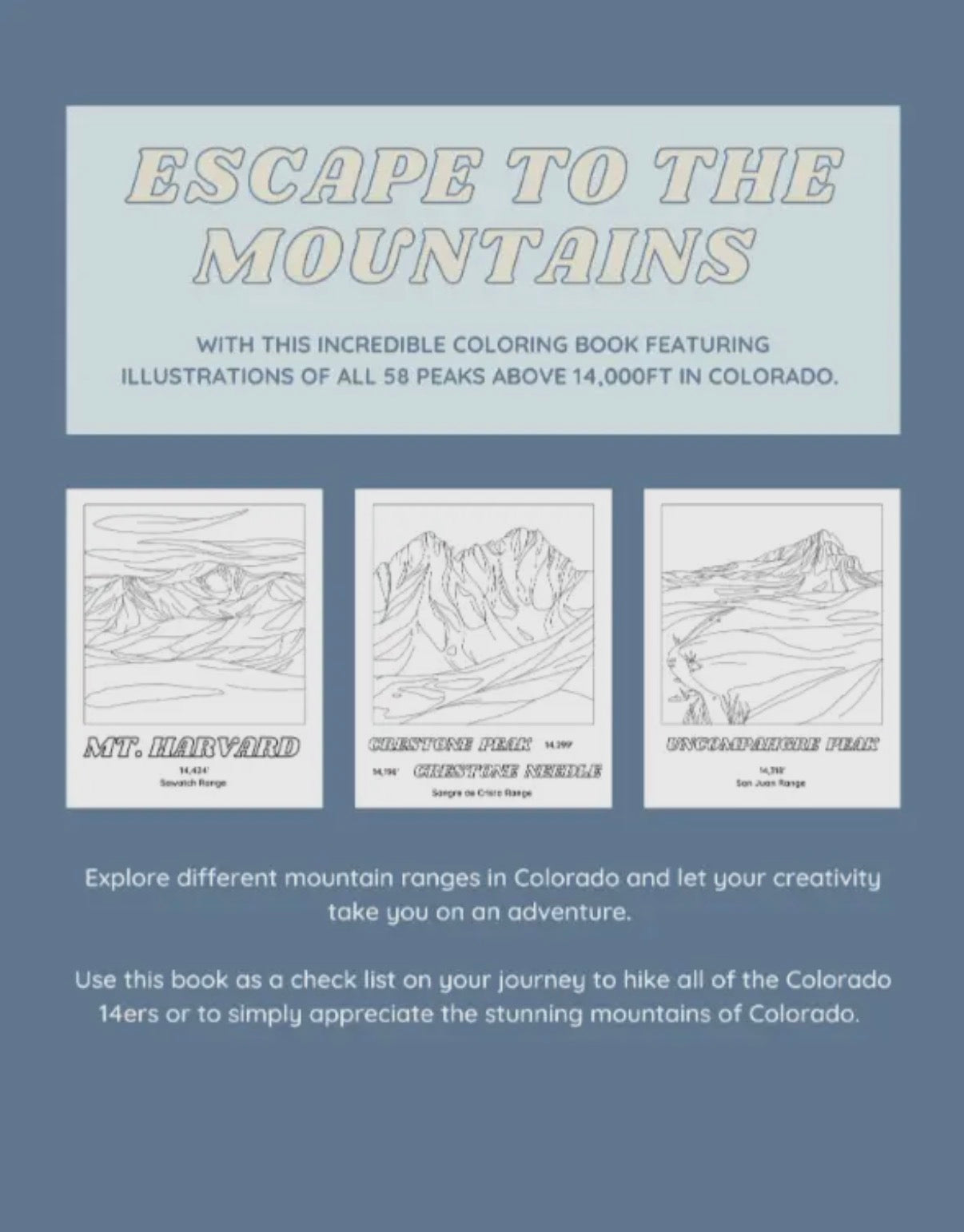 Escape to the mountains with this incredible coloring book featuring illustrations of all 58 peaks above 14,000ft in Colorado.